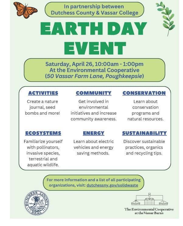 10:00 AM - 1:00 PM: Dutchess County Earth Day at Vassar Farms. 50 Vassar Farm Lane in Poughkeepsie. This is a free event with plenty of indoor environmental education opportunities, giveaways, and interactive activities for the whole family.