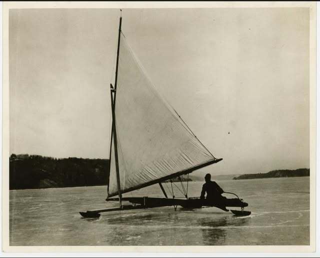 Franklin D. Roosevelt sailing his ice yacht "Hawk" on the Hudson River in Hyde Park, NY. circa. 1905 - Hudson River Valley Institute